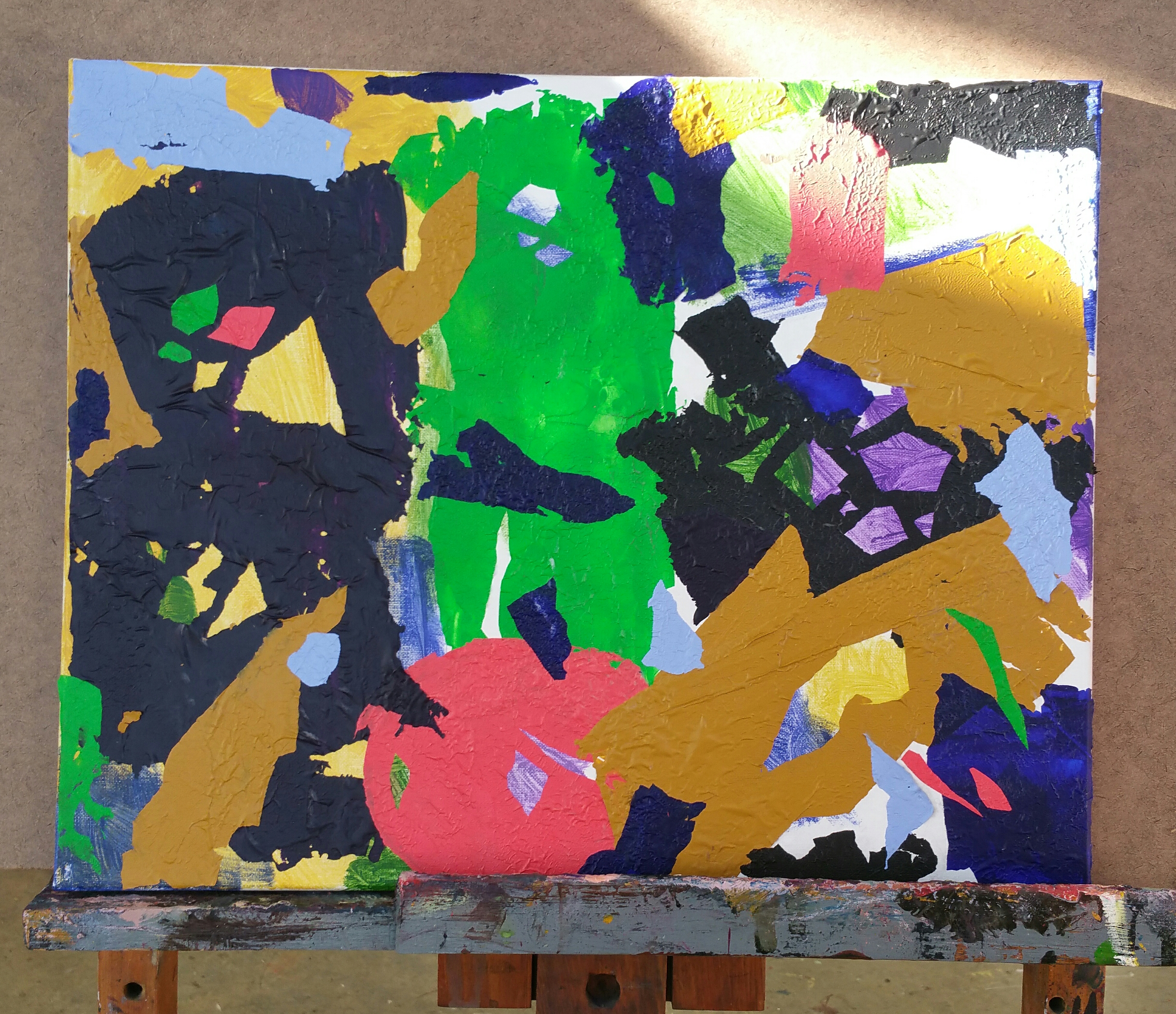 After the paint dries and is removed from the plastic, you can cut it or peel it in any shape you would like. This was the fun part! As I started to apply the paint pieces to the canvas with my medium I noticed it started to create a ridged texture that I wasn’t expecting. I actually really liked this effect and decided to paint over top of this as well. This created an interesting dimension to the painting. After a few days of looking at it I decided to just paint over the whole thing because I didn’t like the colors I was using from the beginning. I still really like the texture of the underpainting I just decided to push it further in a new direction.