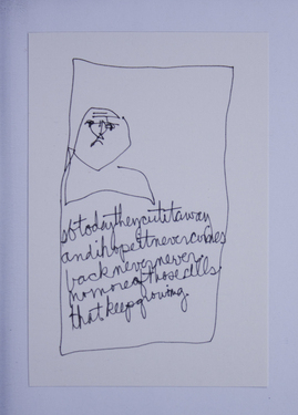 The last sketchbook I’d like to talk about does not have an artist’s name associated with it. It is titled “How to Face Cancer and Life in General” and documents the artist’s emotions and thoughts as they face cancer for a second time. Some of the images they create offer advice, while others give insight into how the artist feels. Often, the images feature a simple line drawing of a face along with words. The words are written in script and go into each other, making it hard to read, which tells me that the artist’s thoughts are racing and tend to jumble up. The words in this image are hard to read, so I’ll translate them for you: “so today they cut it away and I hope it never comes back never never no more of those cells that keep growing.” The artist’s desperation is so evident here that it truly strikes you. Seeing the images in this sketchbook made me so sad, yet I feel hopeful knowing how healing art can be – especially since I’m an art therapy major. The Sketchbook Project gave this artist the means to document their feelings and try to cope with their diagnosis and treatment. I think that’s beautiful.