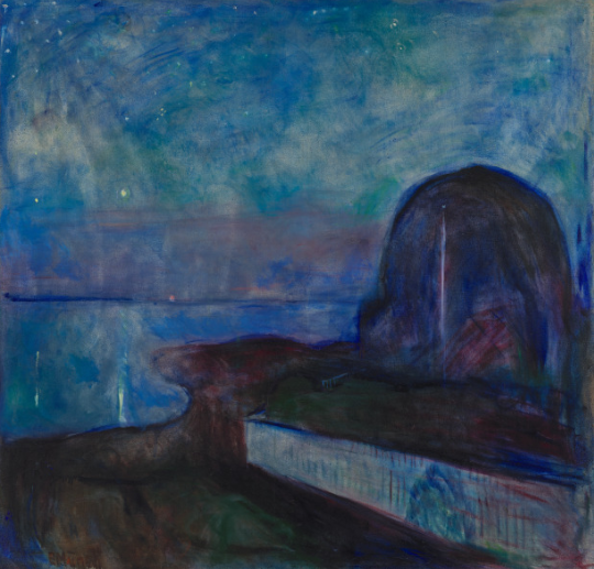 When thinking about art and a starry night I’m sure the first artist that pops in your head is Vincent Van Gogh. The Starry Night is one of the most iconic and well known paintings by Van Gogh with its swirling sky and expressive brush strokes. Yet, just a few years after this particular depiction of a starry night we have Edvard Munch’s own creation in his Starry Night. Van Gogh and Munch, while working in two different artistic movements, Van Gogh with Post-Impressionism and Munch with Expressionism, both have some very similar characteristics when it comes to analyzing their styles. Both artists suffered at times from a declining mental health and those emotions have shown themselves through their use of color and brush strokes in their expressive paintings.