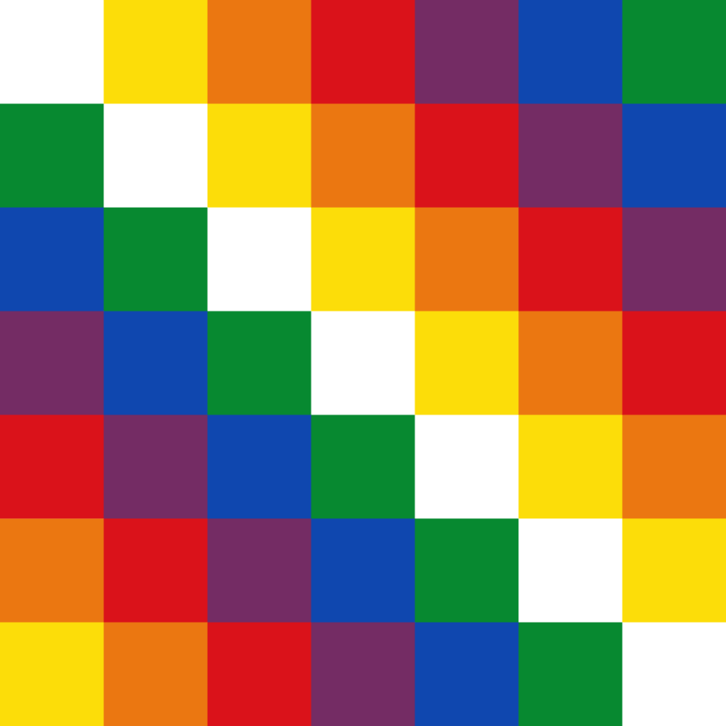 This week I wanted to find out more about the Whipala, which has been the dual flag of Bolivia since 2009. I found that learning about its history and the unique meanings for each of its colors gave me a better understanding of the culture it came from, as well as the culture it currently exists in. In recent times, this flag has been adopted as a symbol of resistance for the Indigenous people of Bolivia and their supporters during the election of Bolivia’s first indigenous president, Evo Morales. It has only gained further notoriety as a symbol of this movement after the controversial U.S.-sponsored coup d’état in November of 2019 that would unseat Morales with president Jeanine Áñez, causing a political crisis that would upset a newly established economic and social stability in Bolivia. However, in 2020, Luis Acres, a member of Morales’s MAS party would win the general election by a large margin, effectively overturning the contested results of the 2019 “election.” Áñez has since been arrested and is being investigated for her illegal actions during her presidency (exploitation of Indigenous people/draining Indigenous resources for the lithium is just one). It is a fascinating story to keep up with, I’d recommend investigating it if you have the time.
