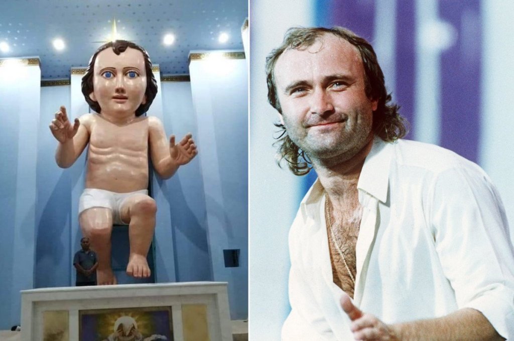 The other absolutely bizarre thing about the Theotokos is the way the child Jesus is depicted. Usually, he doesn’t look like a child at all, rather a full-grown man of small scale in comparison to Mary. But first… look at this sculpture of Baby Jesus in Mexico next to Phil Collins… it sort of sets the scene for the rest of the examples.