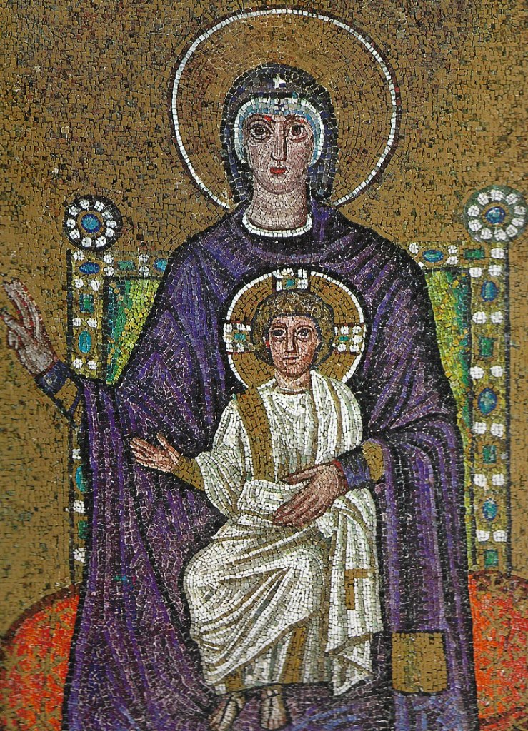 This week I wanted to talk a little bit about Theotokos, or the Greek orthodox word meaning “Mother of God.” Theotokos can also mean “God-Bearer” and was formally declared a title by the Council of Ephesus in 431 AD, an extremely heated meeting of over 250 bishops in order to deliberate whether or not the Virgin should be titled Christotokos (Christ Bearer) or Theotokos (“Theo” being God-Bearer). While it may seem nitpicky, the nature of this deliberation was an argument around the fundamental belief that Christ was both God and Human, an assertion that Theotokos followed as opposed to the “Christ-Bearing” narrative of Christotokos. Depictions of the Theotokos version of Mary is almost always either a front-facing portrait or slight side view and is accompanied by a robed Virgin holding the Christ child with halos encircling both of their heads.