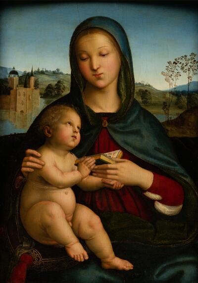 Another reason for Jesus’s Man-Child appearance in Theotokos pieces has to do with the divine nature of Baby Jesus. According to Eastern Orthodox beliefs, Jesus is incarnate of both humanity and God, therefore he is divine in himself, which is why Mary is known as “God-Bearer” in the Orthodox Church. So, because he is a divine-human, Jesus was born in a fully-formed state. In fact, in many images, he actually has a receding hairline and aged facial features. He looks older than his mother! It is interesting to watch how these depictions have changed over time, too. Take a look at Raphael’s Renaissance Madonna and Child as compared to the Theotokos of Kazan. Raphael’s Christ Child looks much more like a… child, at least proportionately. Heck, even works from the Early/Pre-Renaissance still shared elements of the man-bodied Christ child. Check out the Madonna done by Giotto below.
