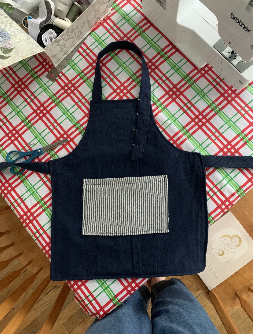 My niece is at the age where she likes to help in the kitchen with mommy and she has been wearing my sisters apron that ties at the neck. I thought it would be cute to make one for her and my nephew that fits their sizes. So, of course I did research on Pintrest. The basic parameters were: size has to fit small toddler, but not too small; color should be unisex so all children can use it; it should be a sturdy material so it can get wet without seeping through; and it should be able to grow with them as they bigger.