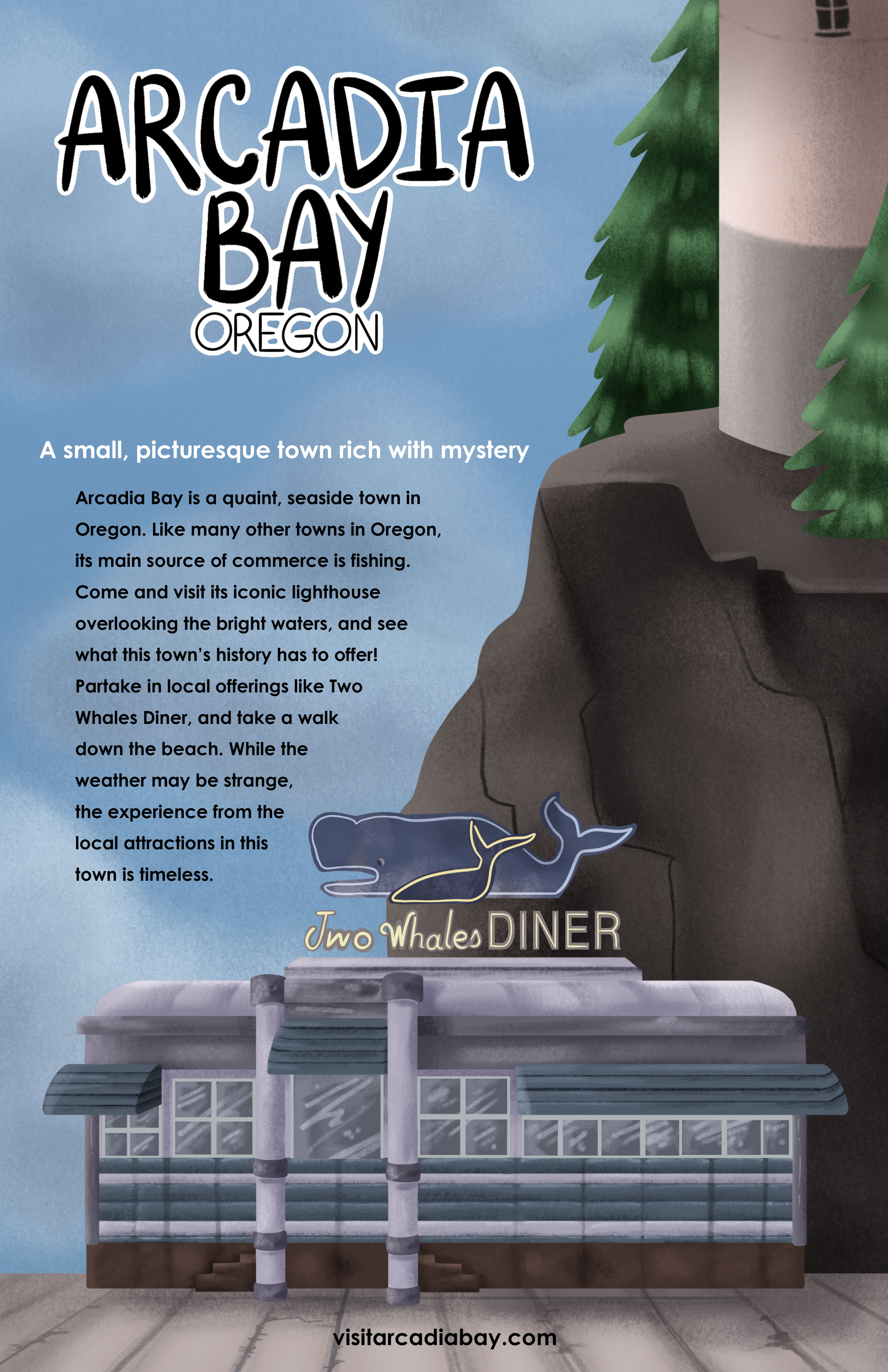 All of the drawing was done in Procreate, so after I finished the drawing, I saved it as a Photoshop file, uploaded it to my Google Drive, and then took it into Photoshop to work on the text. I hand-lettered Arcadia Bay, Oregon in Procreate, but all of the other text was done in Photoshop. It took a little guidance from my professor to place the text in the best spot possible, but overall I am really happy with how the poster came out!