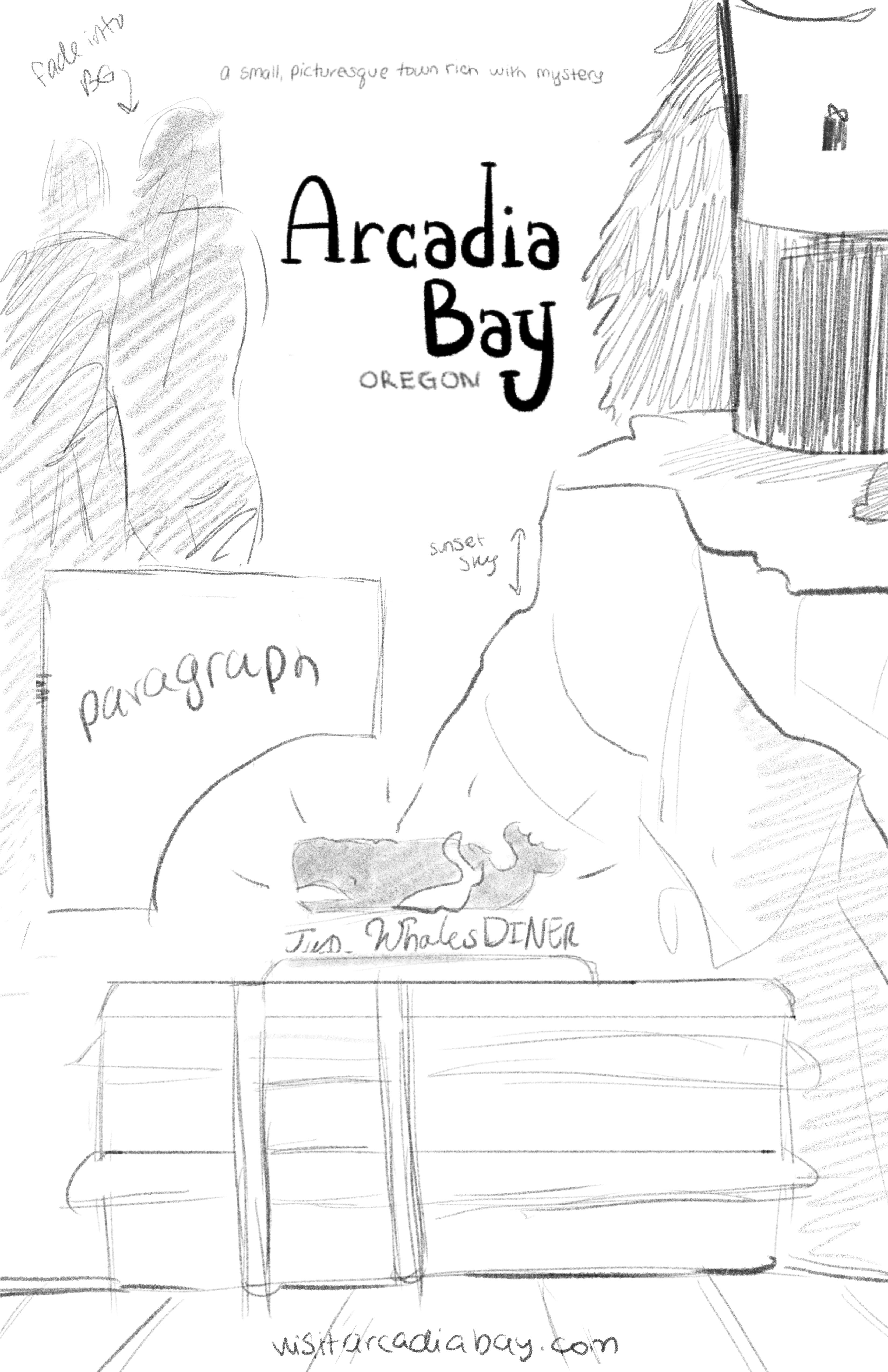 For the travel posters, we were allowed to choose a place that was real or fictional. I didn’t feel inspired by any real locations, and so I wracked my brain for a fictional one that I would enjoy working on. I ended up choosing Arcadia Bay, Oregon, from the videogame Life is Strange. Sure, I could have just created a travel poster for the town that Arcadia Bay was inspired by, but I thought that doing the videogame town would be fun, and also a bit of a challenge as it isn’t the first place one would think to go when making vacation plans.