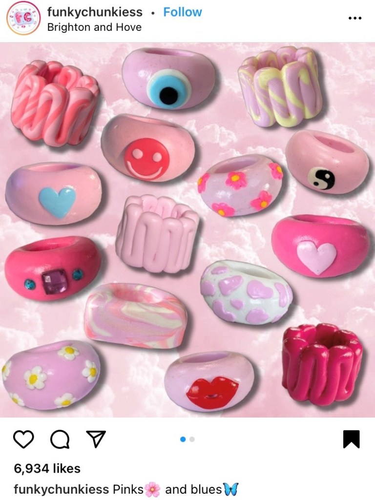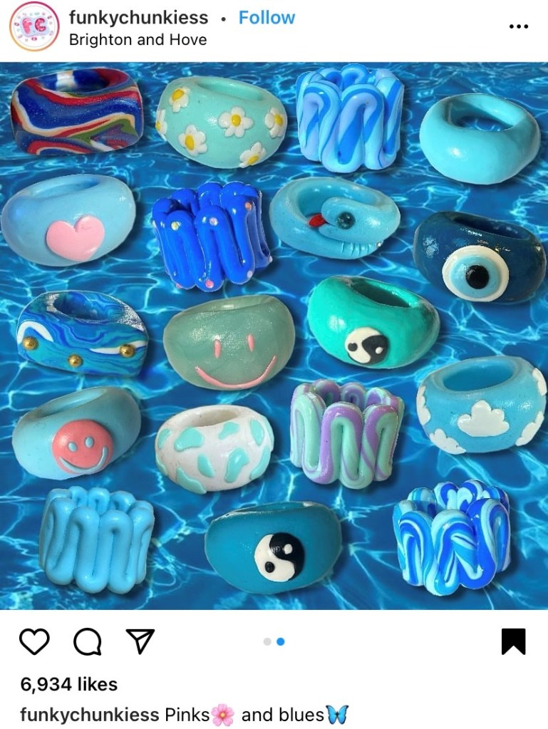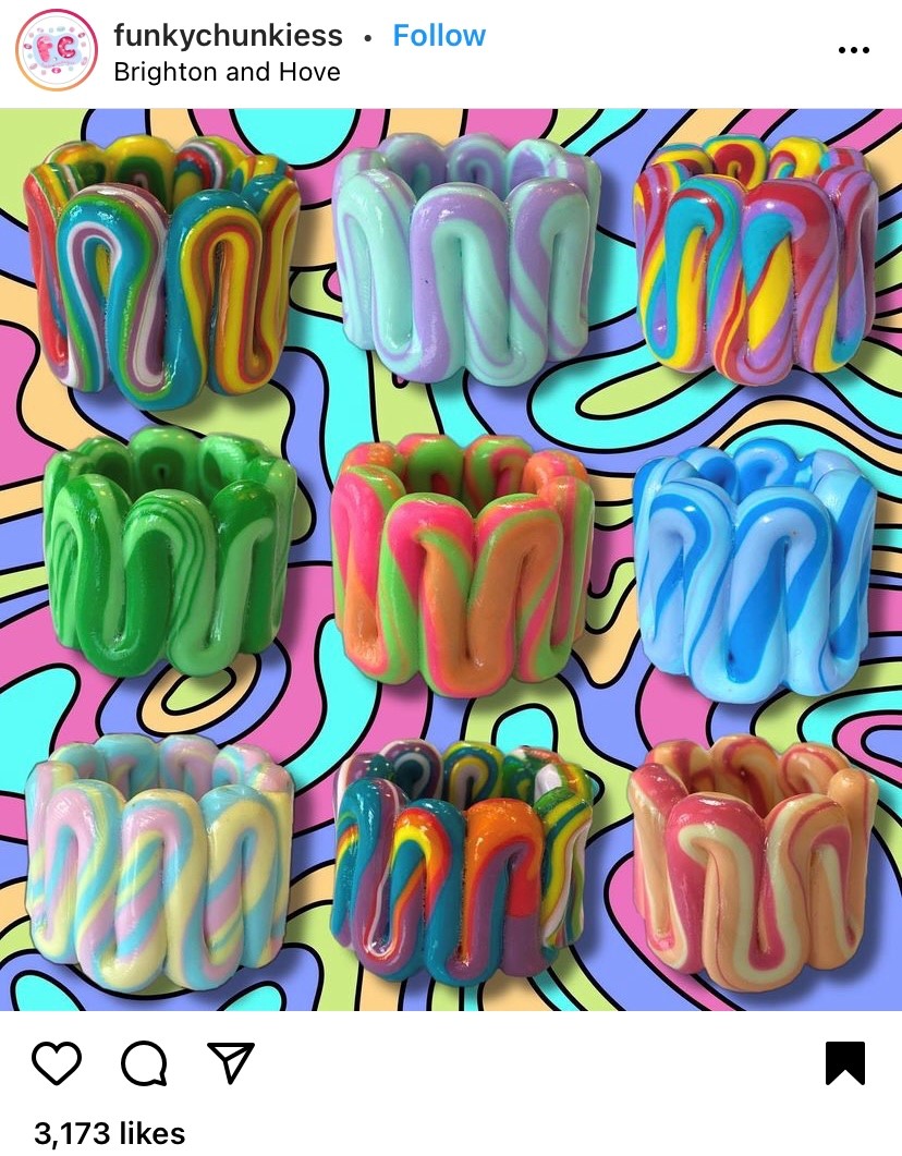 Below are some pictures of one of the accounts I came across with someone making these rings and some examples of their final products. The more swirled rainbow ones are my favorite. They’re so colorful!