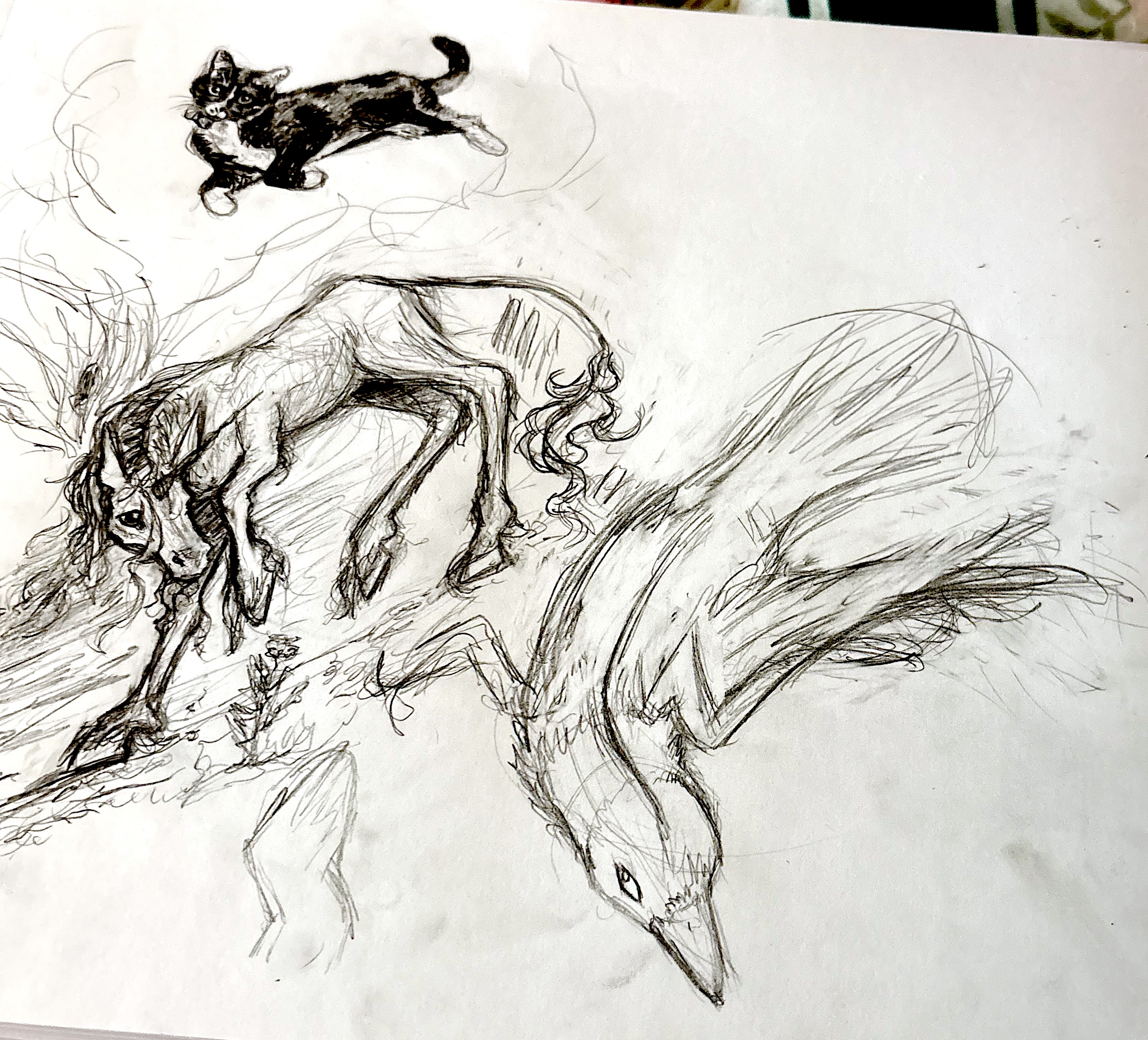 So the unicorn began, but as I was making it, a cat appeared on my page! Suffice it to say, I have no idea how that happened. I couldn’t have put that there! I never get distracted while sketching! Ok, in all seriousness, a major point of this exercise is creating my art mostly from the mind. I’m way more comfortable working from an image or from life. Creating things the way I want them to look from my brain is a struggle to me, but also an aspiration. So, mid-unicorn, I drew from a picture of my cat to bring me back into the spirit of things, and it did 🙂 I then started the crow.