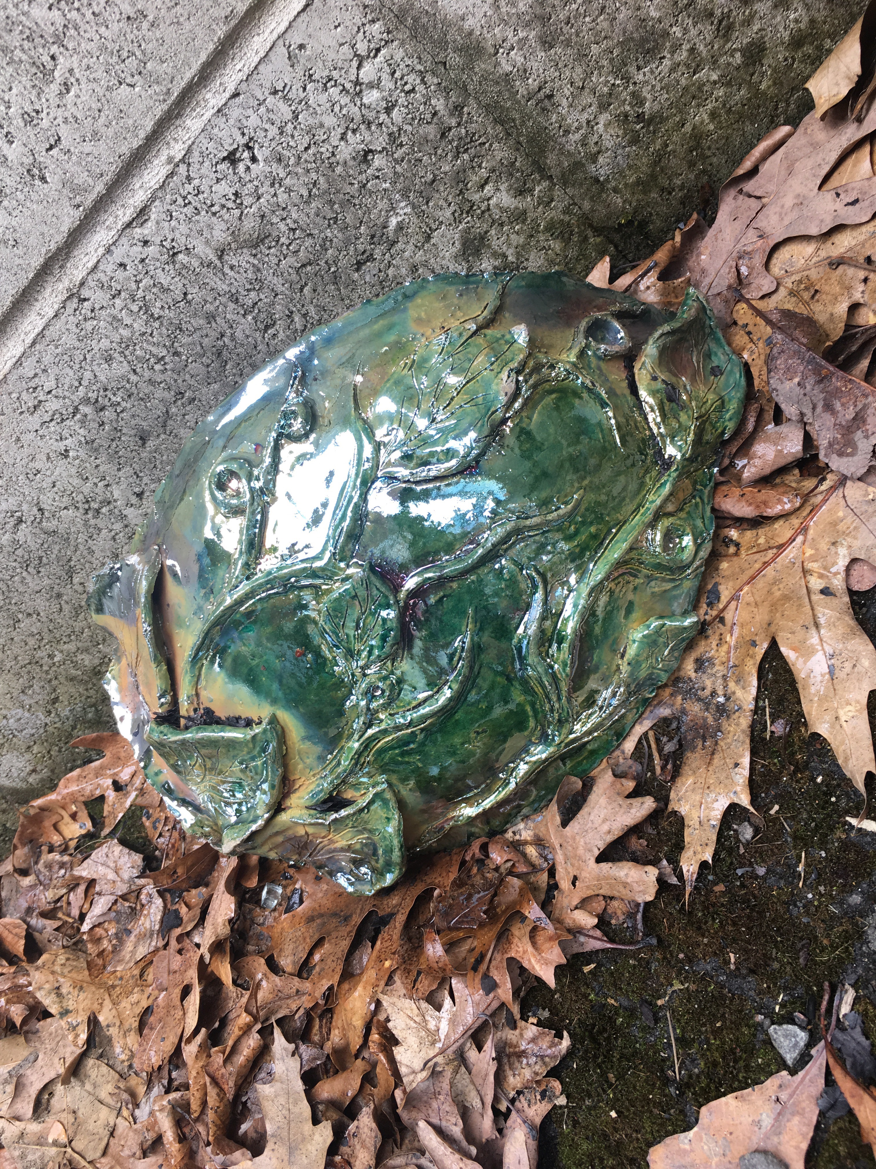 The green piece, which represents earth, is made from clay. It was raku glazed and fired. I love raku because it leaves a metallic finish on the glazed piece and it looks amazing. I’ve written about doing a raku firing before in First Ceramics Class: Part 2. It showed the process of raku and how the glaze gets its metallic finish from the reduction during the firing.