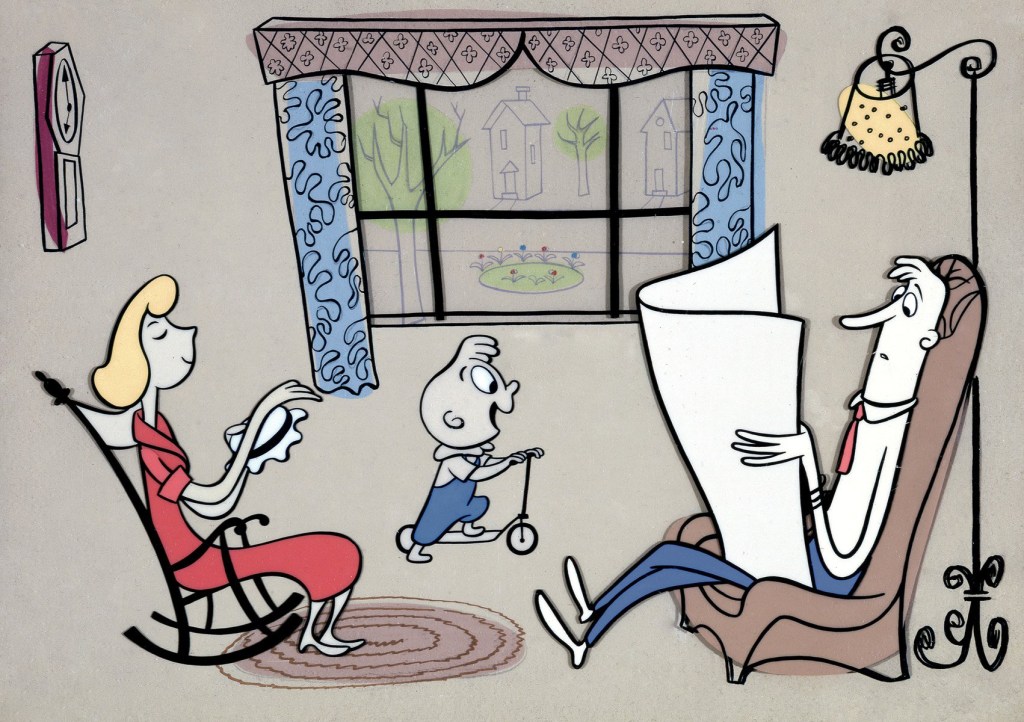 Although the studio would produce several titles for Columbia Pictures between 1948-1950, each enjoyable and fasinating in their own right, the release of their 1951 Oscar-winning short film, Gerald McBoingBoing, marked the beginning of UPA’s earning of commercial success and uncompromised creativity. Directed by John Hubley and Robert Cannon, Gerald McBoingBoing is an adaptation of a Dr. Seuss story of the same name, following its titular character, a boy only capable of speaking in sound effects. By this time in their filmography, UPA had experimented with various new animation techniques and, at that, had been experimenting under stricter budgets than their competitors; but Gerald McBoingBoing stands as the first time the innovations the UPA staff had fought to portray since before the Disney Strike finally come to fruition— what would later define the studio as their signature UPA style. Gerald McBoingBoing feels understated but thoroughly characterful and confident. Whereas their contemporaries formulaically applied a realistic approach to the fantastical, UPA stylized the human— films starring regular people abstracted into simple shapes and lines put into worlds that implied their space through muted colors and a few simplistic key features. UPA’s ethos stood as minimalistic but, in doing so, becomes more deliberate— more intently focused on putting as much character as possible into each design, so, while a setting may only contain no more than a few colors or lines, you immediately understand not just the space but, through the more focused colors and expressive character, the emotionality of the scene. In this way, UPA’s style exists as impressionistic— focused not just on entertaining but on expressing themselves so the audience “gets it,” both intellectually and emotionally.