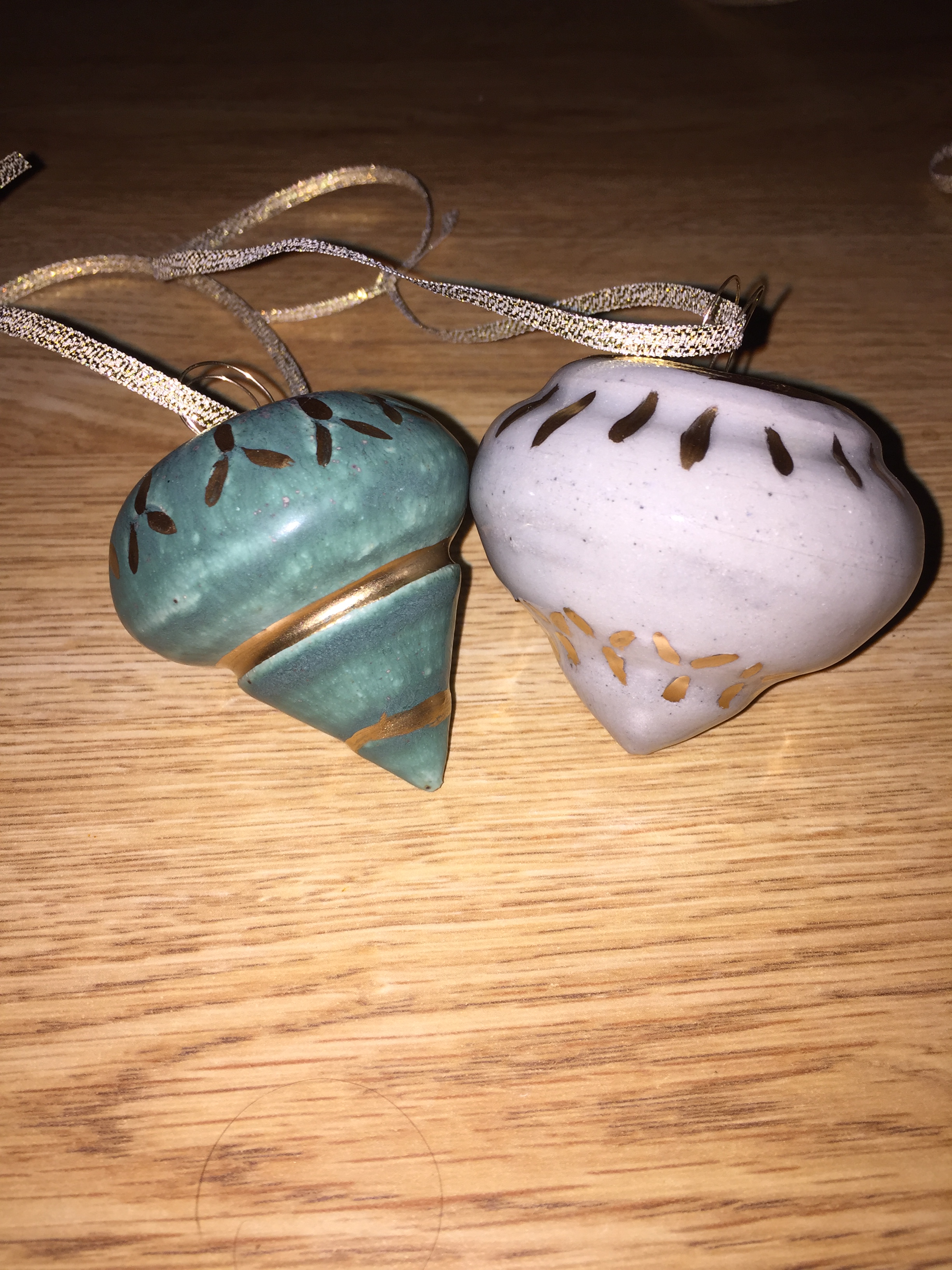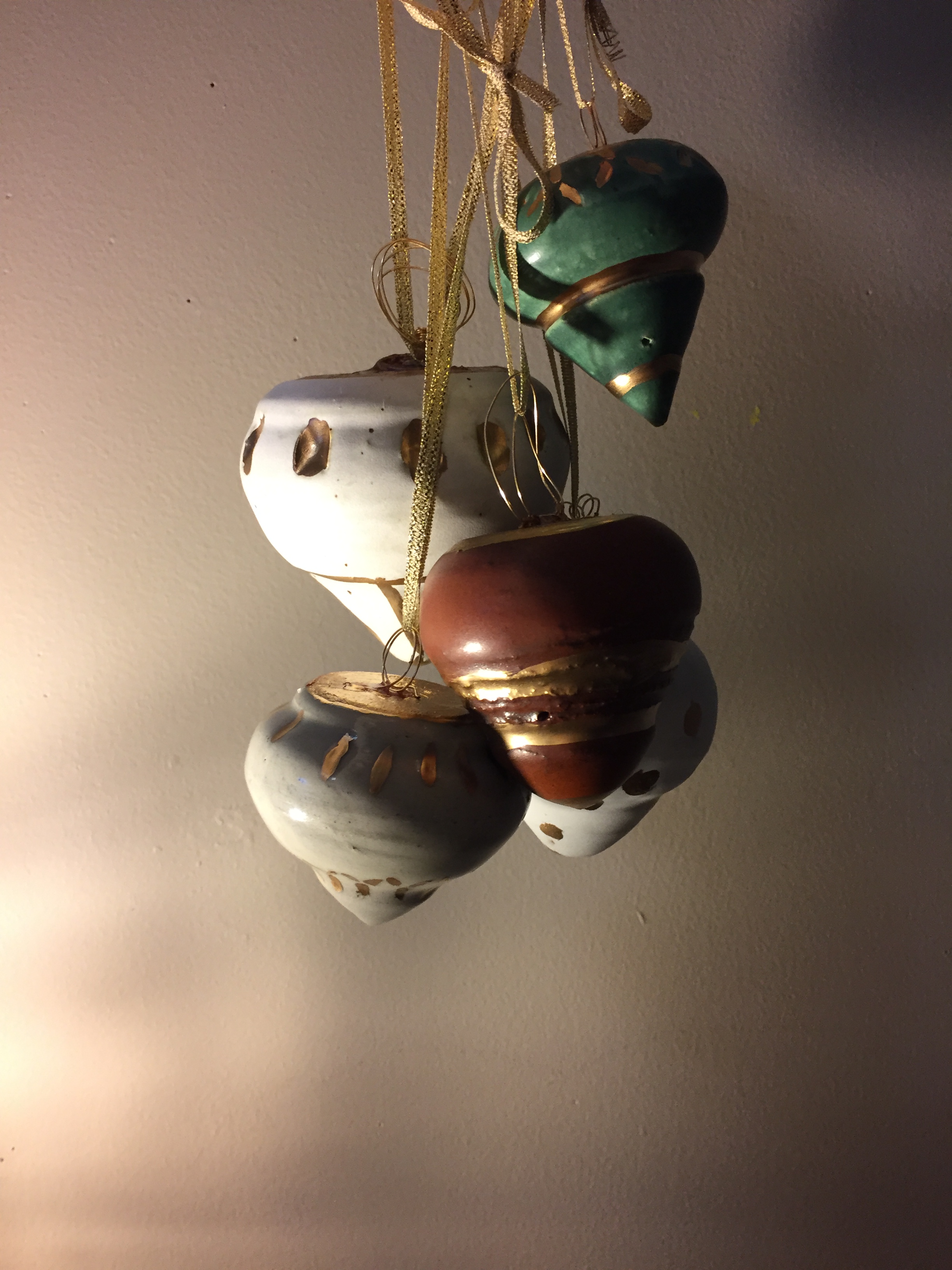 One of the challenges I faced with these were how to glaze them. When a piece is fired, the part of the piece that is touching the shelf in the kiln cannot have any glaze on it, otherwise the glaze will melt and your piece will stick to the kiln shelf and most likely break upon removal. This left me having to figure out what part of the ornament would be unglazed, aka brown when finished. On most of the ornaments I made, I trimmed the tops flat, that way they had a nice place to sit when being fired. Others, I rounded the tops of, so I basically had to wipe an entire side of glaze off of the piece for when it was fired. All of the ornaments that I put in the high fire had flat bottoms, so they were all fired upside down essentially. In order to cover up the brown, unglazed section of the ornament, I bought liquid gold leaf. I’ve never used it before, but I’ve seen it used on different things and it looks beautiful. I painted the tops of the ornaments with the gold leaf, and then added some more on the ornaments in order to accentuate each of their individual shapes. I absolutely love them!