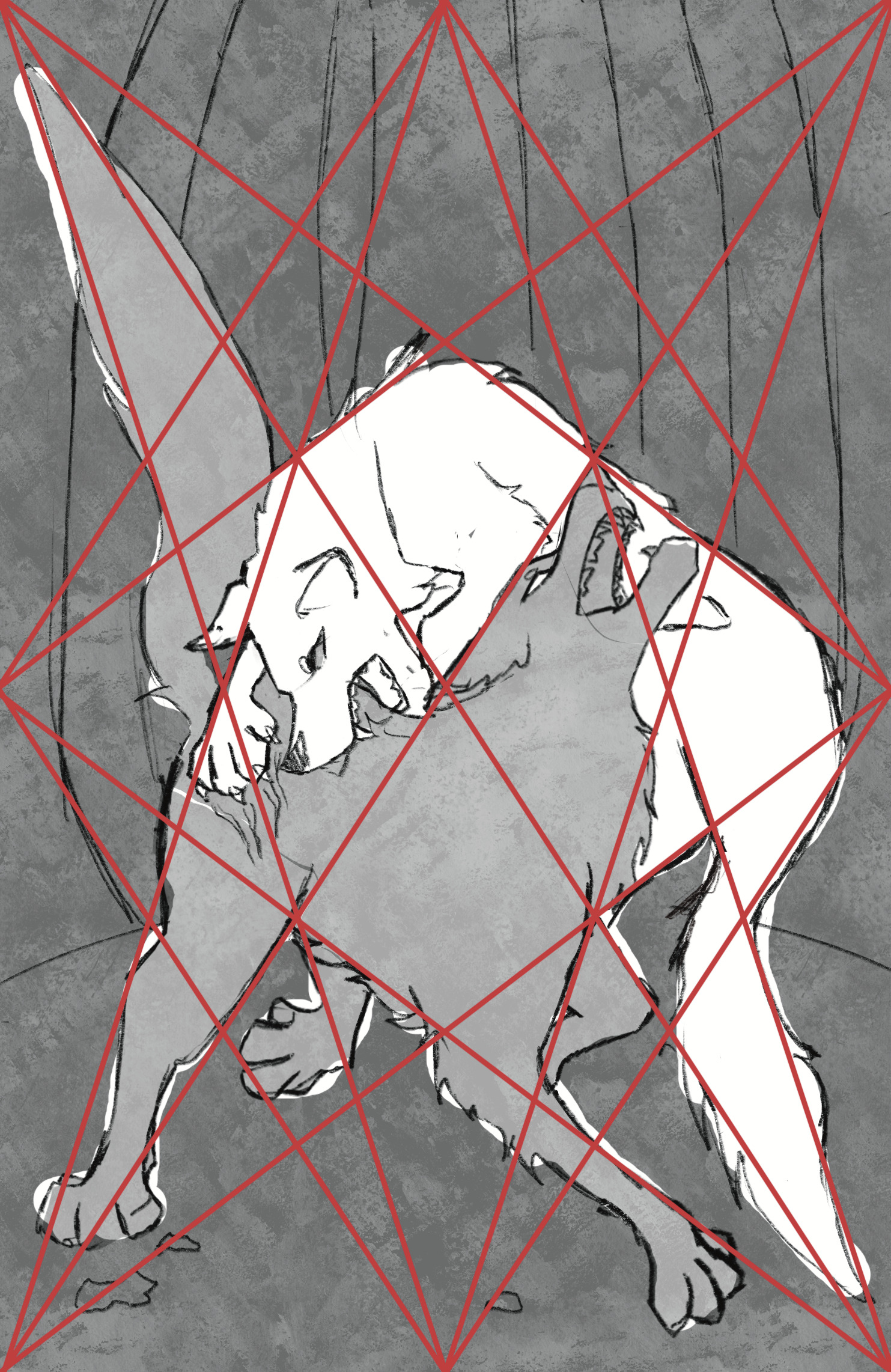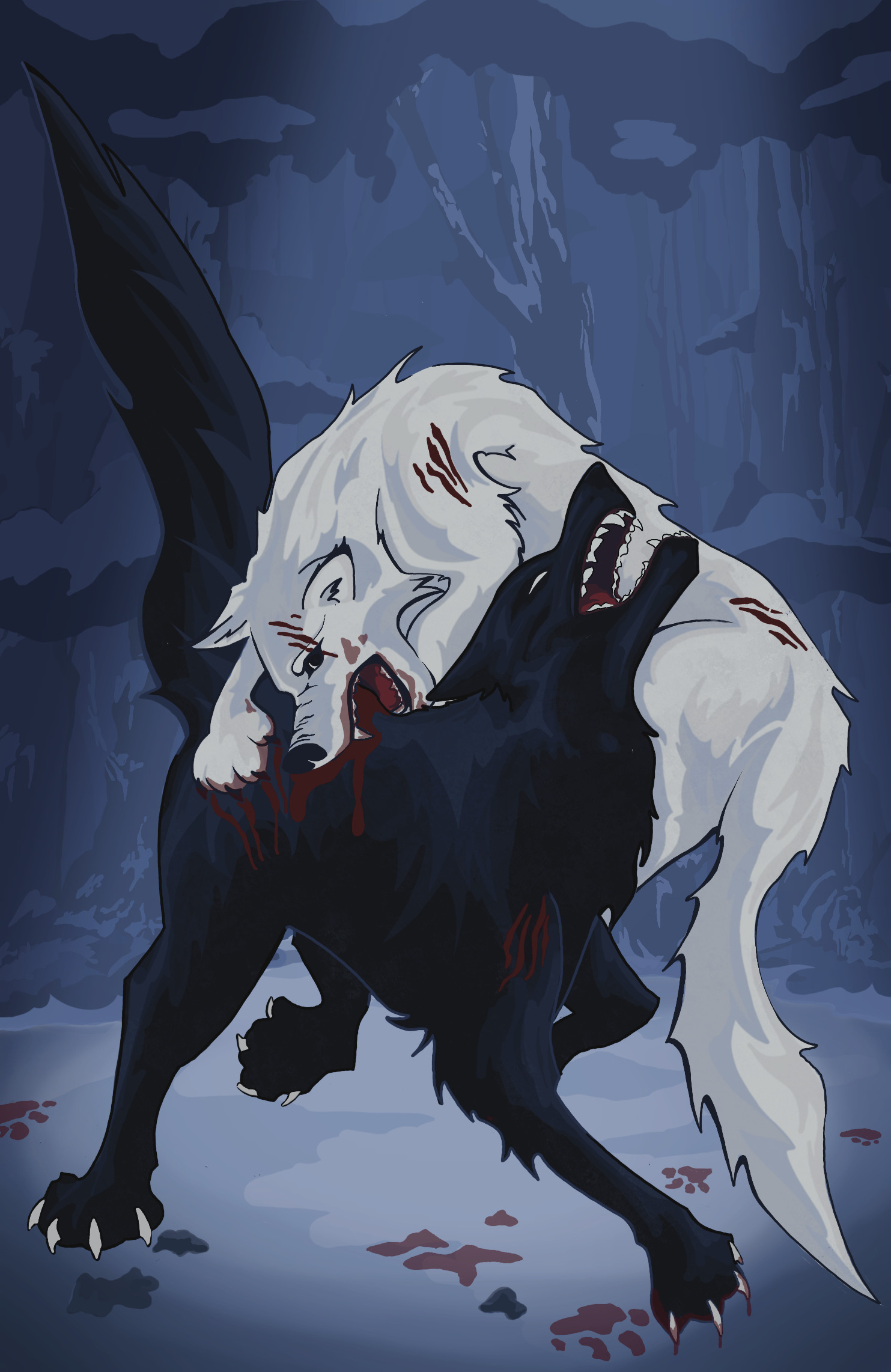 For my piece that used the 14 line armature to create a scene of a fight between two wolves. The lines of the grid were incredibly helpful for creating the dynamic positions of the two wolves. I kept the color palette cool, and set the environment at night in a snowy forest to help set the tone for the piece.