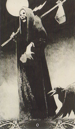 The Murder of Crows version has little to even signify the Fool himself, just the number 0 and the bindle the figure holds signifying a journey. The description in this deck’s booklet embellishes the card with a warning, and urges the reader to take the place of the Fool. This is helped by the figures’ nondescript cloak and mask. While generally noticeable, the booklet is necessary to glean exactly what is meant by this image.