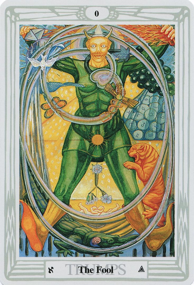 The Thoth deck has practically every piece of original symbolism packed onto this card. At the bottom the triangle representing the element of air is present as well as the Hebrew letter Aleph (since the tarot is thought to originate from the Hebrew Qabalah). The figure wears a jester’s pointed shoes, the horns of Bacchus, wields all four elements, and stands on Harpocrates. These are all symbols of spring/nature and adolescent fertility, which is where this card derives its meaning. This composition is carefully and methodically designed to encapsulate the “beginning” of all things.