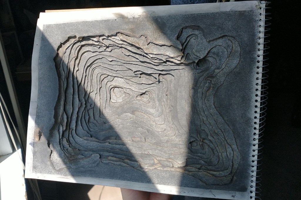 To make, I controlled the fire by outlining in water where I wanted the burnt edge to end. I did this for every page, continuously getting smaller to create a declining void. To add, I rubbed ash into each of the pages to darken them. It became this.