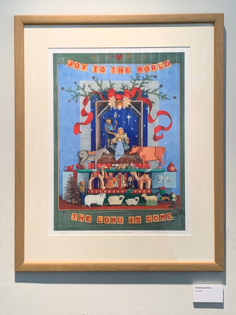 All of the paintings have a religious theme and focus on a passage from the Bible or a saint. The paintings are a shrine to that particular religious theme. Before Mrs. Billingsley started creating this series she was working on creating wall hangings made of fabric. Her inspiration for this series came from the significance of Christmas and the wonderful figures of Christmas.