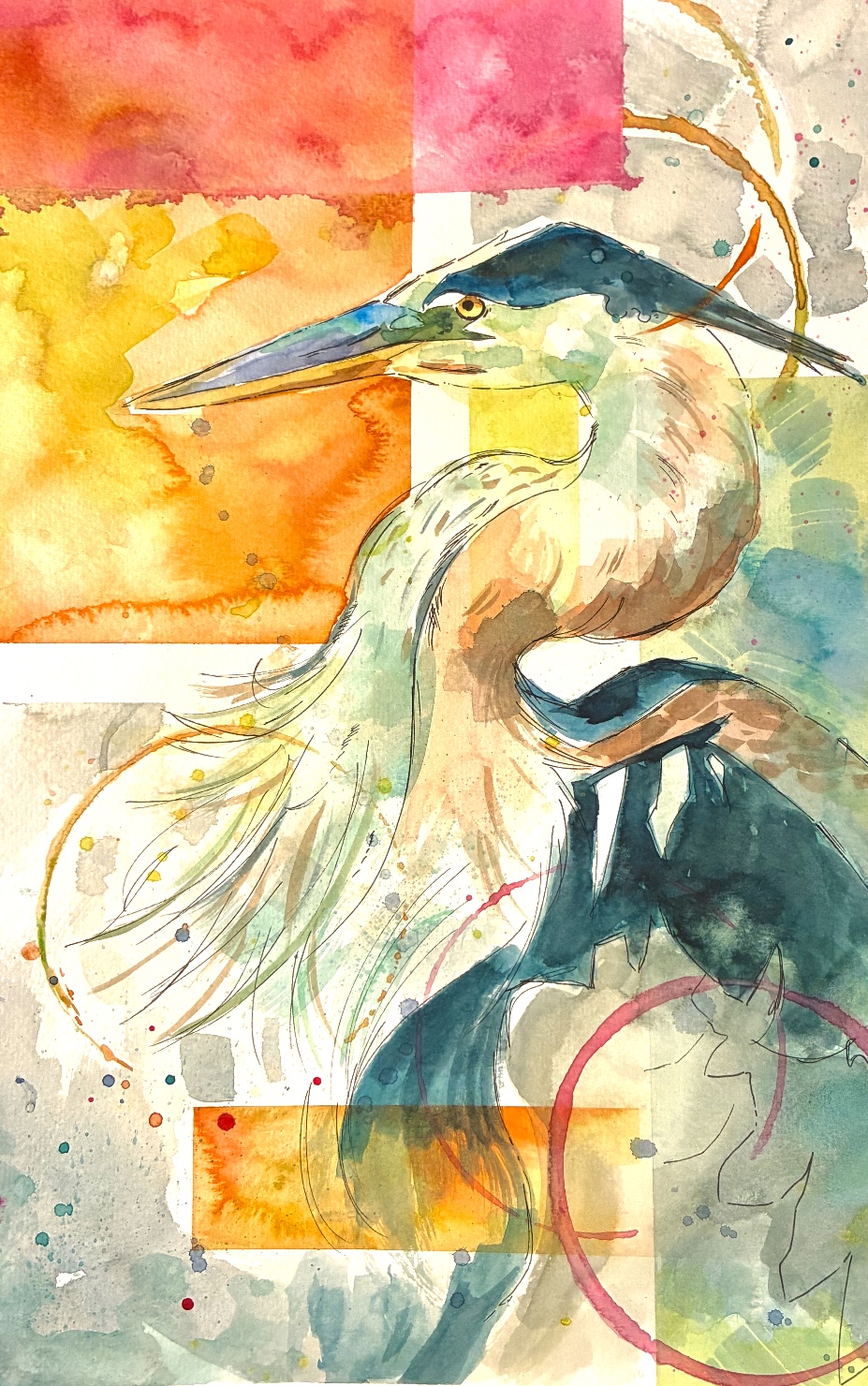 A big part of my brainstorming process simply comes from doing. Something I’d like to focus on in my exhibit is color, and how it can invoke interest and emotion simply by placing one against another. The most beautiful aspect of watercolor (to me, at least) comes through when using the wet-in-wet technique. Even the most unlikely color combinations come to life, as this technique freezes the motion of water in time. In my piece ‘Heron’, I experiment with geometrical wet-in-wet fields accompanied by the image of a heron. This piece is a bit larger than what I typically choose to work with. Rather than my typical 5″ x 7″, this piece comes closer to (about) 11″ x 17″.