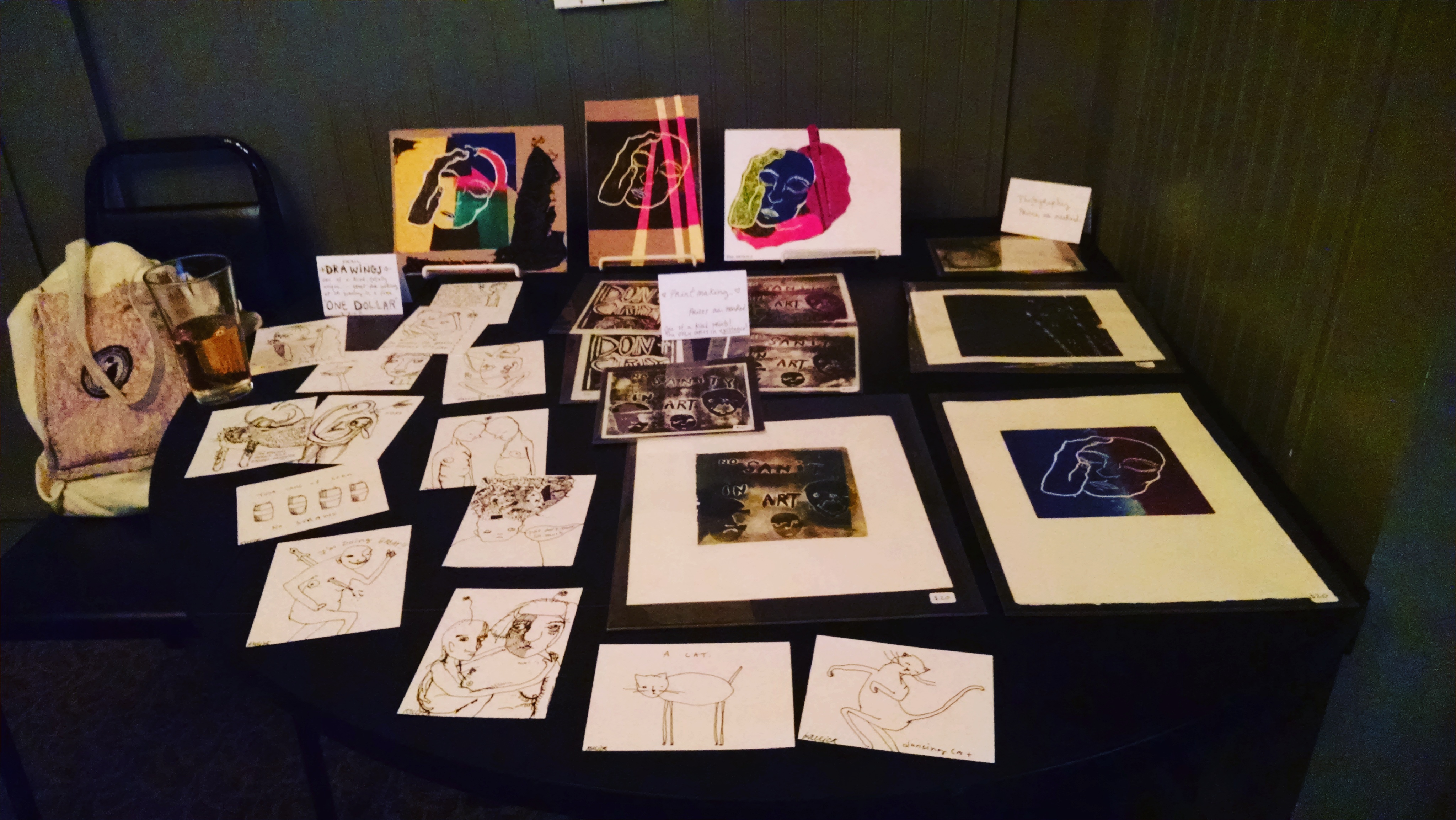 The show was a lot of work. I packed boxes and boxes and bought frames and printed posters and packed more boxes and bags and boxes and one by one I dragged everything into the venue in a sweaty panic. I had a lot more to show than I thought. I was allotted a cozy room off the venue’s main bar/dining area, and I struggled with how to fill the space. I needed tables, easels, more tables, move this table here, no I don’t like it there, let’s move it over here, I need another easel, I’m so SWEATY!