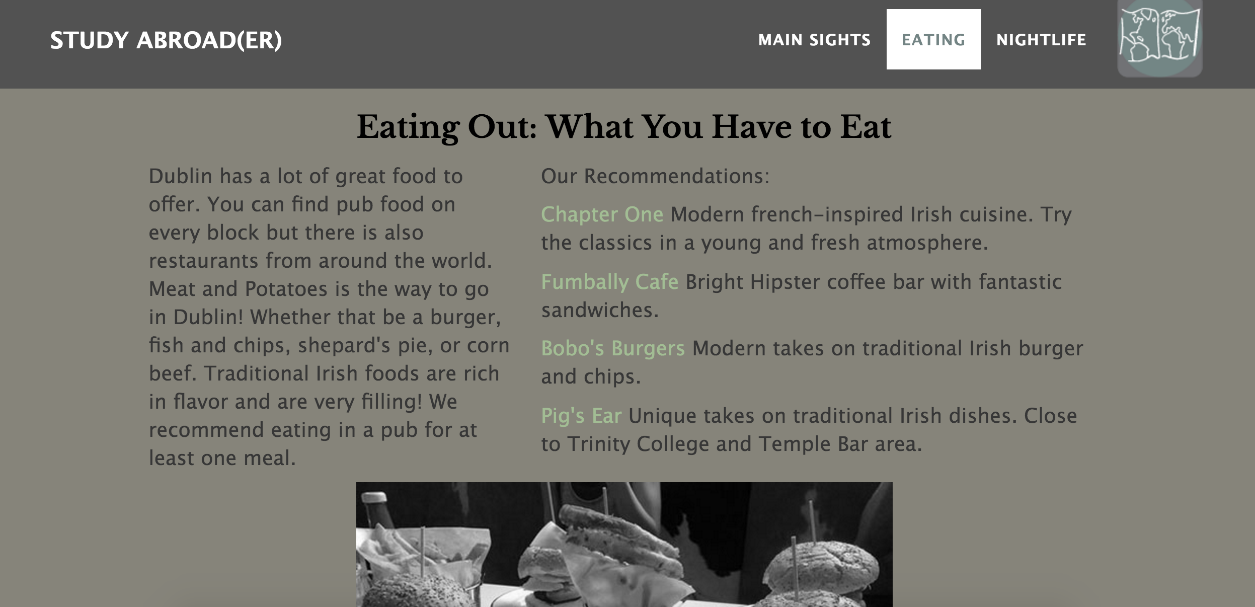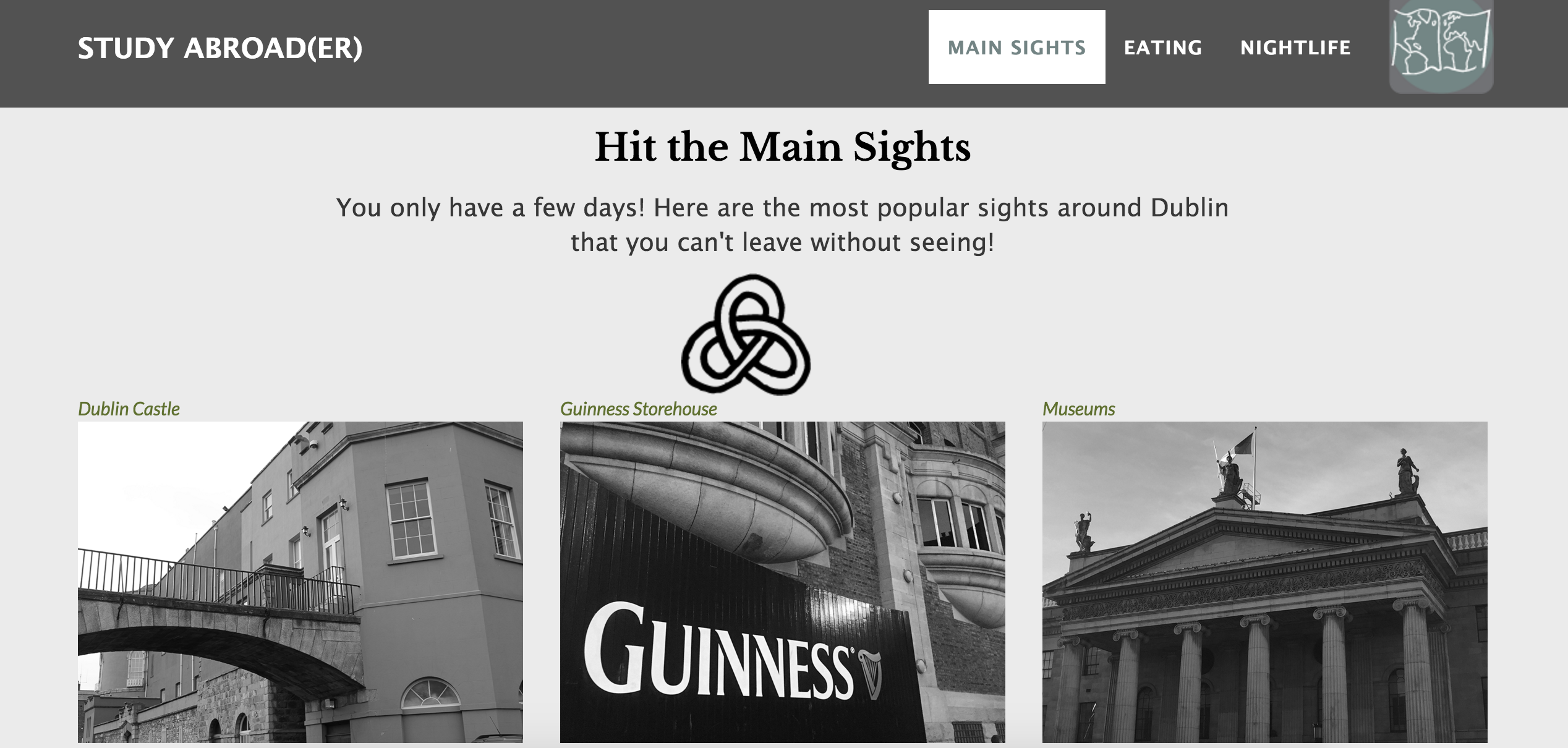 These websites have been very cool to make, but have also been a huge challenge. We all have had to dive into a whole new way of making a website. I was pretty nervous because there is a lot new motions, and effects that we also had to take into account. Our websites needed to scroll correctly, collapse, and expand well too. So we had all of our usual coding to remember, plus new bootstrap elements. With these new skills I made a website about Dublin, Ireland. So, we also needed to put our own content together. If just thinking about this makes you breathe small breaths, then you feel how I felt when I started! But, like everything else, it comes down to time, focus, and hard work.