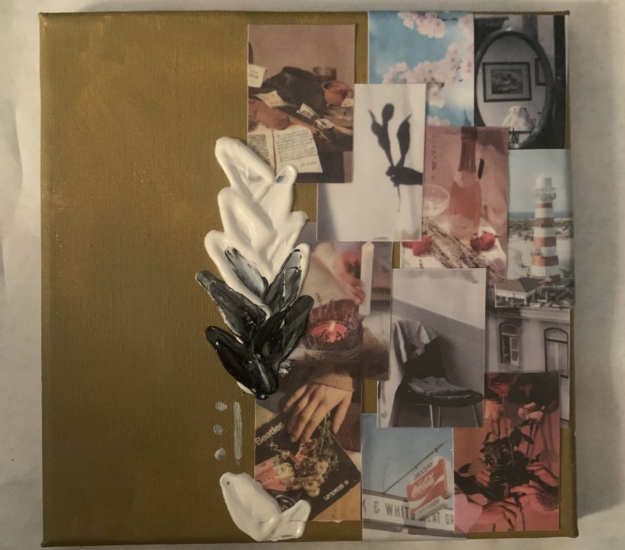 What I ended up deciding to do was paint three different sized canvases. One large, one medium, and one small. I unfortunately do not have the actual sizes to these canvases so I call them small, medium, and large, but you get the idea. I first painted all three canvases with a goldish-brown color as a base because it was one of my favorites that I had left over. Then, I painted the large canvas with the first thing that came to mind that I could create with a pattern which was by using a palette knife to create ridge-like clumps of paint that look similar to leaves and a few white and blue stripes in the bottom corner. After that I moved onto the small canvas and decided to stick multiple stickers on it in an artistically organized fashion with some silver paint marker spots.