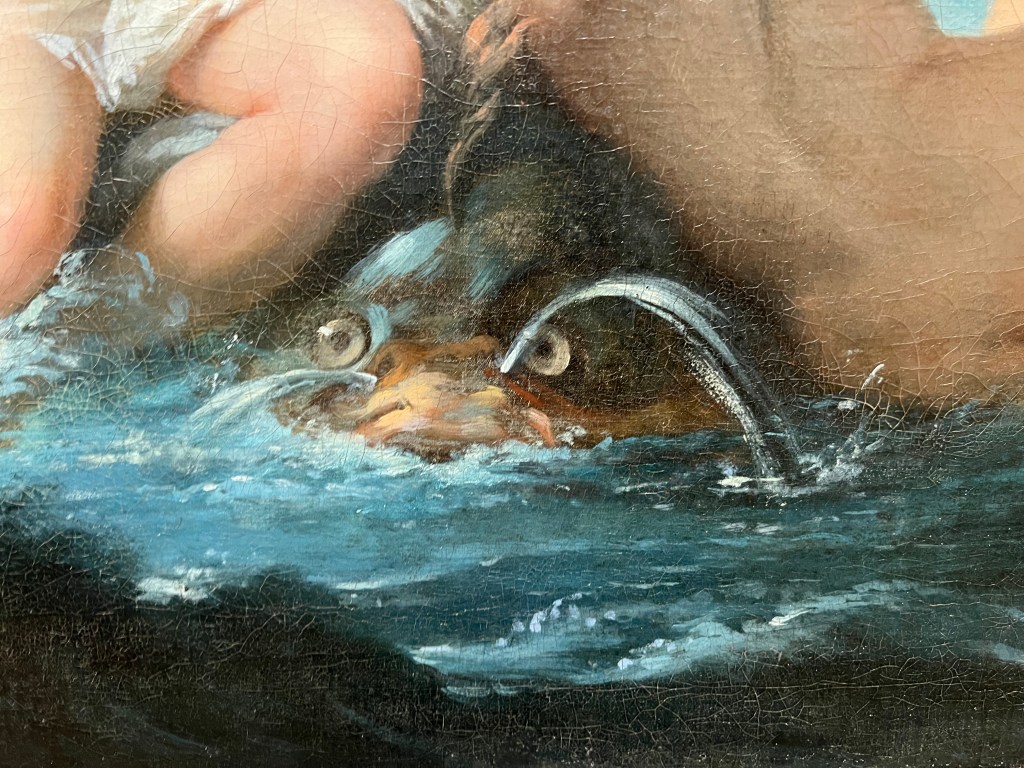 The painting itself is depicting Zeus walking off with Europa still on his back. The cupids are likely the representation of the lust that Zeus was experiencing. The surrounding people are supposedly Zeus’s aids, but it seems too chaotic to be just his aids. When I view this painting, I see her other maiden friends fighting to get Europa back while Zeus’s aids hold them back. The movement is all over. The cupids are flying, the garments are fluttering, the waves are crashing, and the two groups are fighting. Among all of the chaos, is Europa, scared stiff holding onto Zeus since she really has no idea what it going on. It is a truly gorgeous depiction of the biggest moment within the myth. My aim is to go back to Philadelphia so I can stare at it a bit longer, as pictures just do not do it justice.