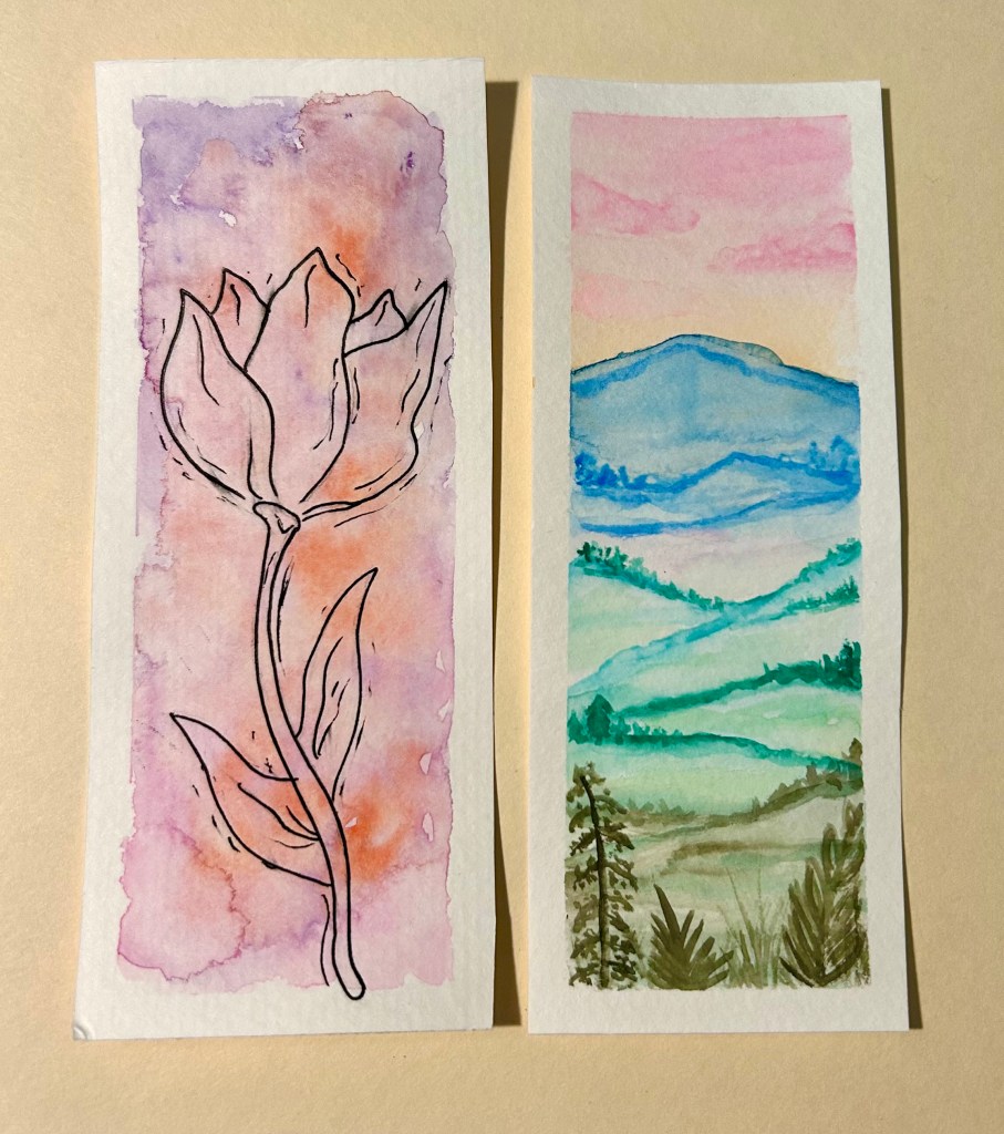 Here I made a few bookmarks because I love reading (when I have the time to!) and I just think that they are so fun and they are really good gifts as well! My favorite thing to paint with watercolor is definitely landscapes, and I also love using black pen to draw on top of watercolor as well.