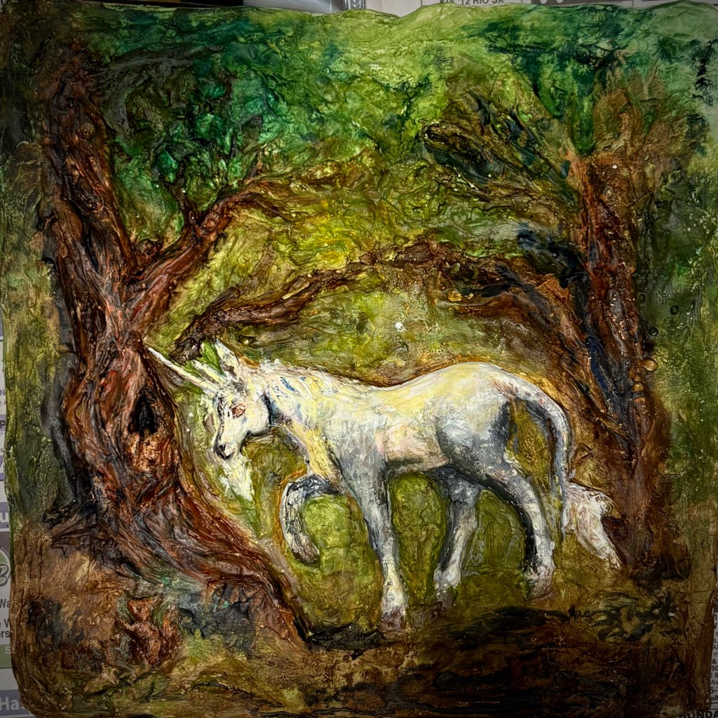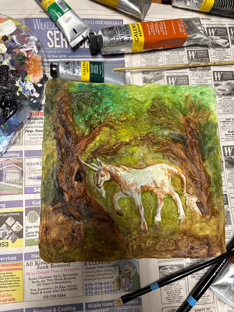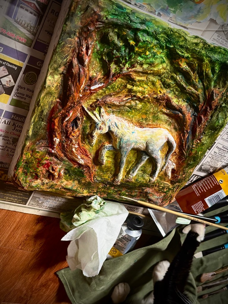 Heya, in this week’s blog post, I’ll still be talking about the unicorn relief. The casting process and plaster casting in general is a bit of a production. The piece isn’t completely done yet, but I’ll show my plaster cast of the unicorn, the painting process, and talk about some things I’ve noticed about painting on plaster. At the end, I’ll also mention a new fun update, so stay ’til the end to find out more!