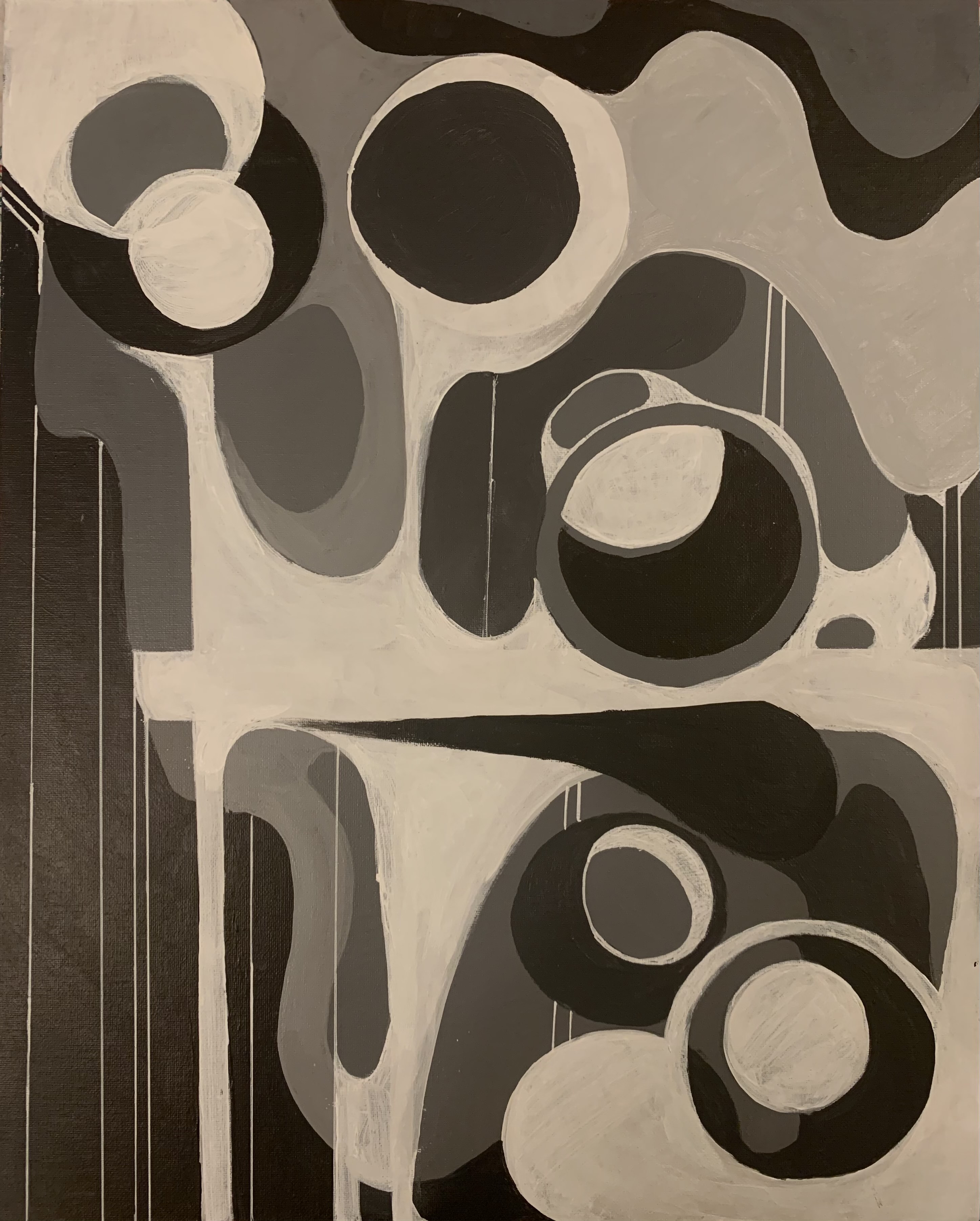 As for the other work, I was assigned to create a series comprising of non-objective pieces that incorporated black and white, as well as grey to create a visually appealing design. While I don’t find myself being an expert in painting, I thought this work was done relatively well as it conveys a lot of movement and curvilinear shapes. However, one element I would change would be the amount of detail I put into the piece, as I feel its too simple. With that being said, the professor liked the work, however encouraged me to work more free and messy for my next piece.