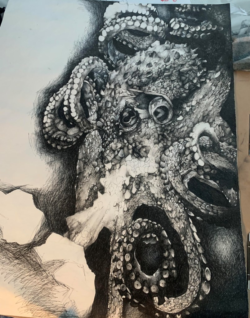 The piece on the left is a recent update regarding my pen and ink work. Unfortunately, I have yet to complete the piece, but through consistent effort I am making slow, but steady progress. While it is almost done, the work still has much left that is in need of address. The individual skin textures on the piece still need to be more refined and the highlights are not all in place, therefore there is inconsistencies in contrast. In addition to this, there is the background and elements that are separate from the main object that need to be accounted for. With that being said, I appreciate how the work incorporates texture and depth to create a semi-realistic representation of an octopus.