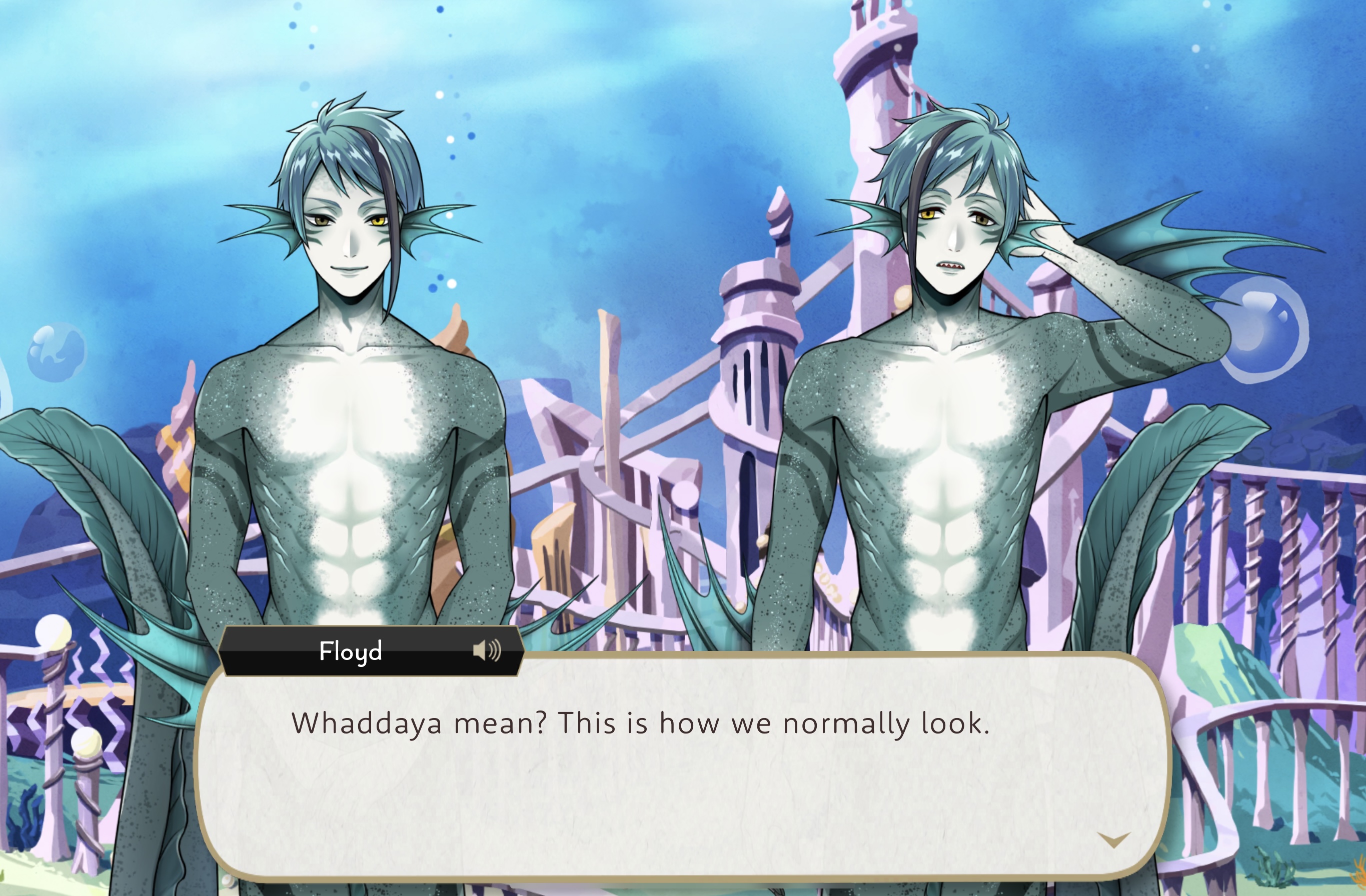 Floyd (the twin on the left) is often seen sporting a lazy smirk on his face in the game, while Jade (the twin on the right) is the more level-headed out of the two. Although they (thankfully) don’t drown their fellow students, they enjoy tormenting their fellow classmates in their own unique manner, so you could say they are “toying with their prey”. Regardless, I wanted to explore the dark side of mermaids while drawing the Leech twins; you could see that this artwork was more so self-indulgent.