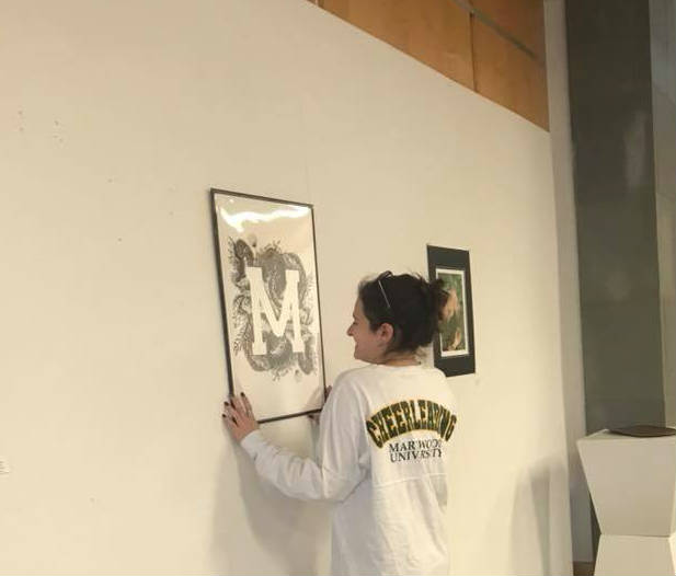 Every Fall Semester Zeta Omicron, Marywood’s chapter of the Kappa Pi’s International Art Honor Society, gathers their best artwork to display in the Kresge Gallery, located in the lobby of the Insalaco Center for Studio Arts. This weekend a few members came together to hang the show.